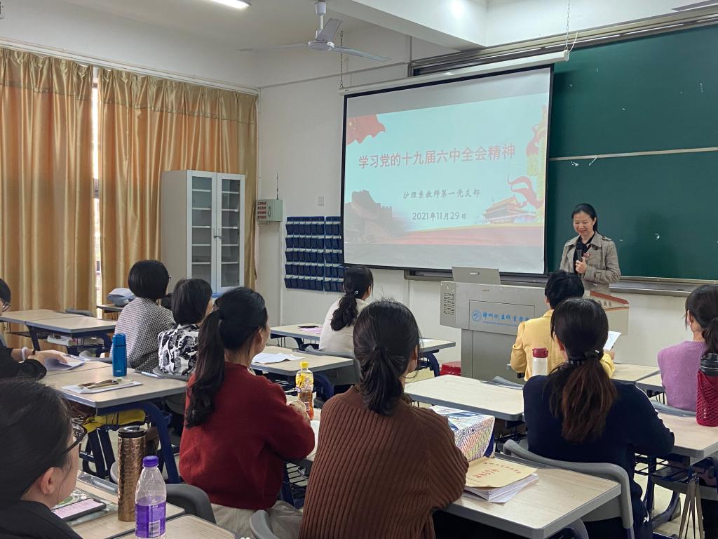 活动中,各支部书记领学《中国共产党第十九届中央委员会第六次全体会议公报》,通过展示党的十九届六中全会精神的重要内容向支部师生党员深刻讲解了中国共产党百年奋斗的意义和价值所在。中国共产党的百年奋斗,从根本上改变了中国人民的前途命运、开辟了实现中华民族伟大复兴的正确道路、展示了马克思主义的强大生命力、深刻影响了世界历史进程、锻造了走在时代前列的中国共产党等这些具有全局性、历史性的重大意义。各党支部书记要求全体师生党员要深刻认识党的十九届六中全会召开的重大历史意义、政治意义和现实意义,结合党史学习教育,做好宣传宣讲工作,推动全会精神进课堂、进头脑。
