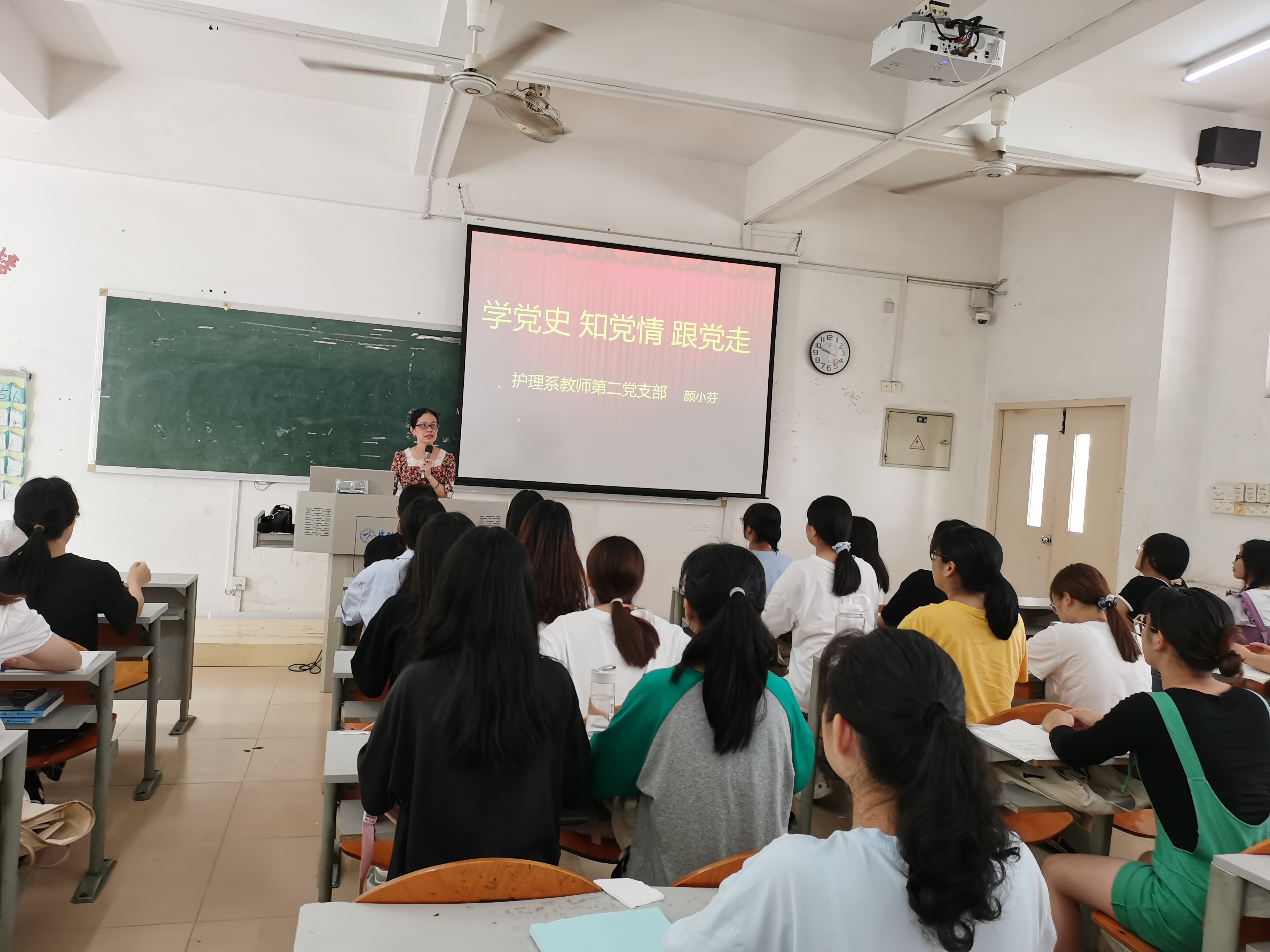 2021年6月17日,护理系教师第二党支部书记颜小芬走进2020级高职助产1班,开展“学党史 知党情 跟党走”专题党课。