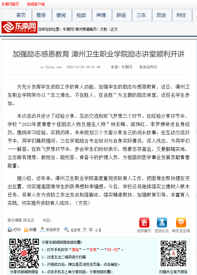 媒体护苑|东南网:加强励志感恩教育 漳州卫生职业学院励志讲堂顺利开讲