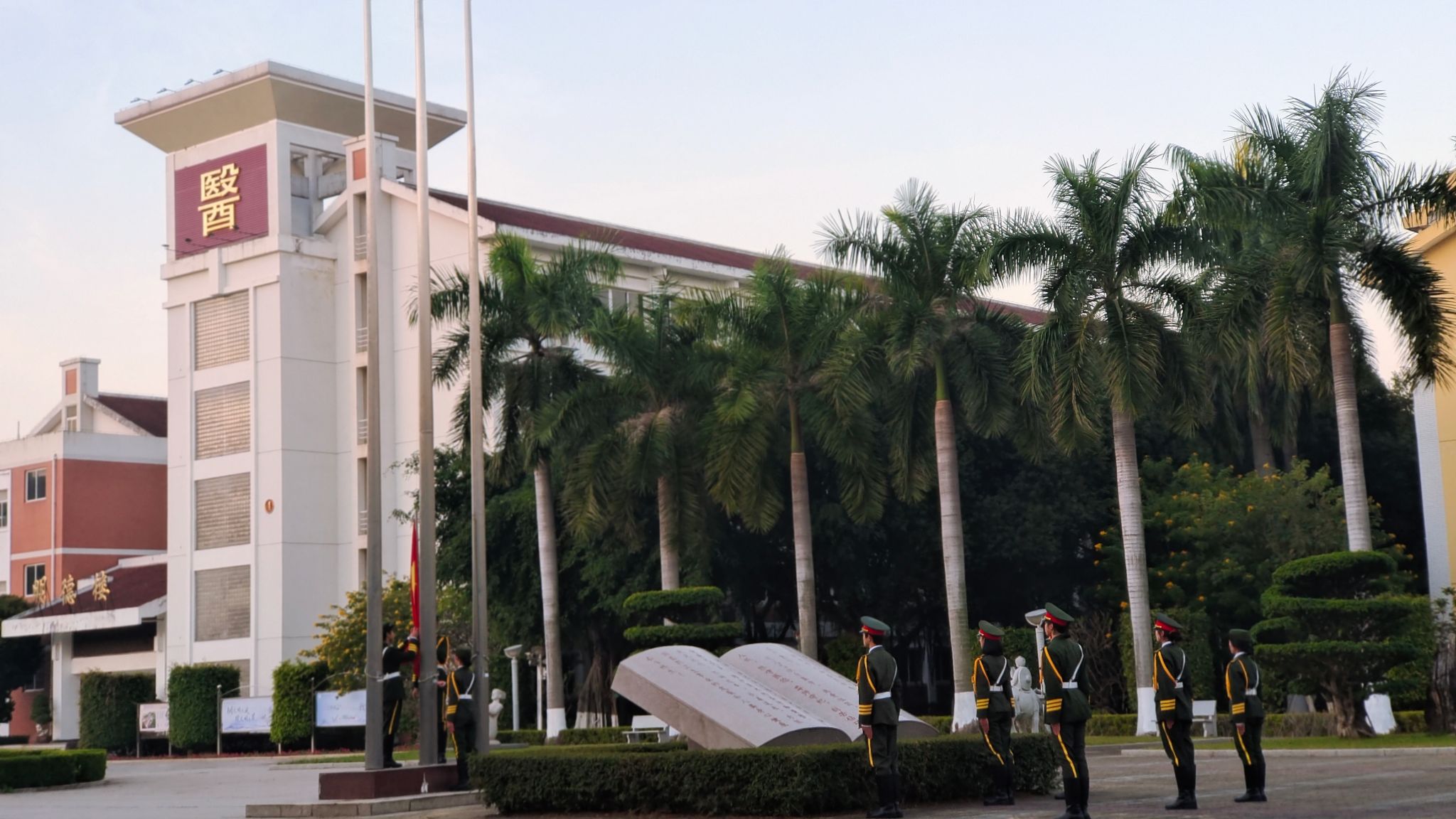 早晨7点,国旗护卫队队员身着军礼服护送国旗走向旗台。五星红旗伴随着《义勇军进行曲》徐徐升起,全体师生目光坚定,共唱国歌。