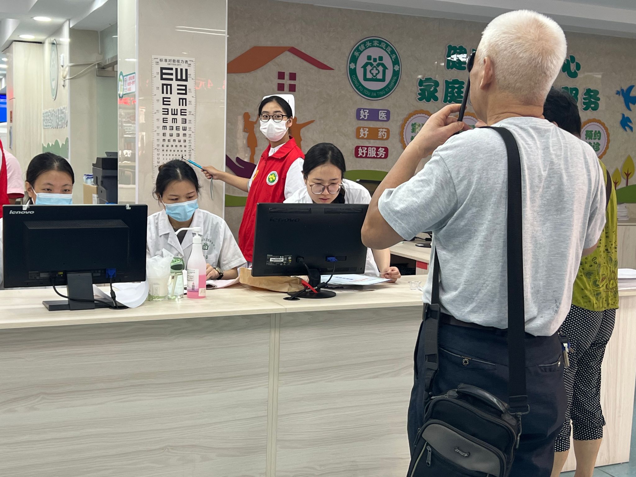 活动现场,志愿者们积极向医护工作者们学习,并迅速分为多个小组,各司其职,井然有序。一部分志愿者担任导诊员,他们耐心细致地为前来就诊的居民指引方向,解答疑问,让每一位患者都能感受到家一般的温暖;另一部分志愿者则化身为“健康小卫士”,利用所学专业知识,为居民们测量血压、血糖、身高体重,并进行了视力初步筛查等等。他们秉持认真负责的态度,用心记录每一项数据,对居民的健康状况给予初步评估和建议,并适时进行健康宣教,获得了社区群众的一致好评。