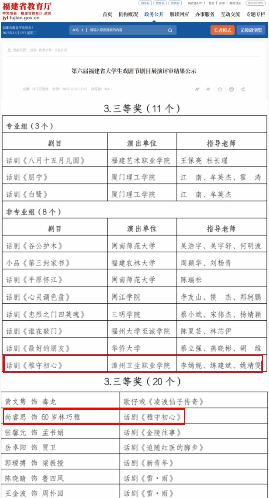近日,由福建省文学艺术界联合会、福建省教育厅联合主办,福建省戏剧家协会承办的第六届福建省大学生戏剧节剧目展演评审结果正式公示。由我校李嫣妮、练建斌、姚靖雯老师指导的原创情景剧《稚守初心》凭借深刻的主题内涵、精湛的舞台呈现与鲜明的艺术特色,在全省众多优秀作品中脱颖而出,荣获剧目展演三等奖,剧中主要演员尚睿思同学荣膺个人表演奖三等奖。