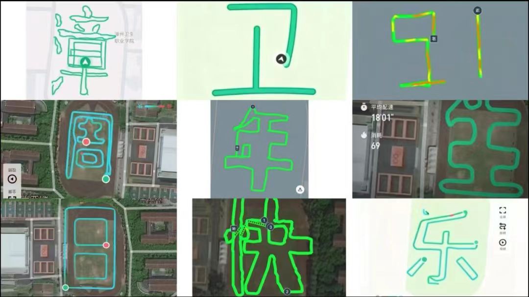 创意跑活动涵盖轨迹创作、荧光夜跑及视频祝福三大环节。以步为墨,绘就护韵荣光。学子们借助卫星地图软件精准规划路线,以汗水勾勒“漳”“卫”“91”“1934”等校庆元素轨迹,串联对母校的真挚告白;“护小烛”“心电图”“提灯”等专业特色图案,彰显创新思维与学科素养,使每段奔跑皆成独特祝福载体。荧光映夜,共赴校庆之约。夜幕下学子佩戴荧光道具,沿校园预设路线奔跑,流动光影交织成绚丽图景。奔跑中,大家齐声传唱校歌、喊响校庆口号,将青春活力与爱校情怀融入夜色,为校庆增添别样氛围。以声为礼,共颂漳卫风华。各班通过创意拼字定格寄语,录制集体祝福视频。学子们精神昂扬,口号铿锵,既凝聚班级向心力,更让校庆喜悦在校园持续回荡。