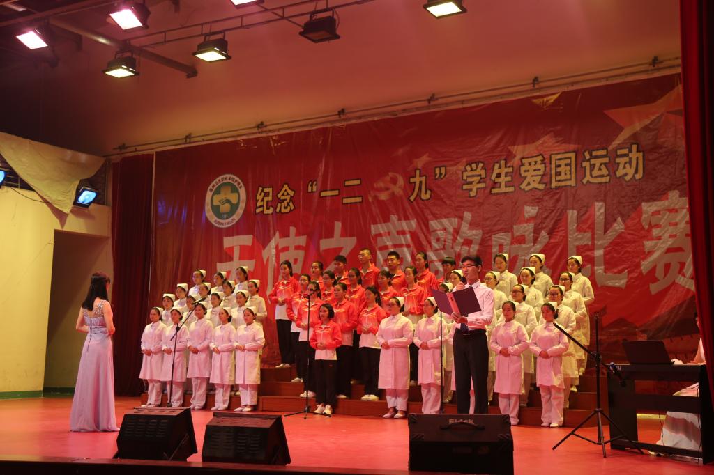 经过前期淘汰赛,最终有八个班级参与决赛。《红星闪闪》、《让我们荡起双桨》、《国家》、《我的祖国》、《红旗飘飘》、《团结就是力量》、《七子之歌》、《红星闪闪》、《大中国》等一首首脍炙人口的红歌被演绎得淋漓尽致,各班对歌曲的诠释均有特色,或编排入朗诵、或融入舞蹈、或穿插情景剧等,热情唱响了共产党好、社会主义好、改革开放好的主旋律;必唱歌曲《白衣天使》婉婉道出护士无私的关怀与平凡的奉献精神。比赛现场群情激昂、异彩纷呈、高潮迭起。整个比赛中,台下观众始终保持着高昂的热情,掌声和喝彩声交相辉映。台上的同学将积极向上、爱国主义的精神风貌通过气势宏伟的歌声表现的淋漓尽致。同学们饱满的热情、嘹亮的歌声、整齐的着装、朝气蓬勃的精神面貌给评委老师和观众留下了深刻的印象。