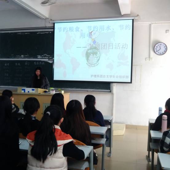 为培养引导团员们深刻理解“节约光荣,浪费可耻”的社会主义荣辱观,2016年12月26日护理系团总支学生会组织部于明德楼1教对系部团员代表开展了“节约粮食、节约用水、节约用电”主题团日活动。