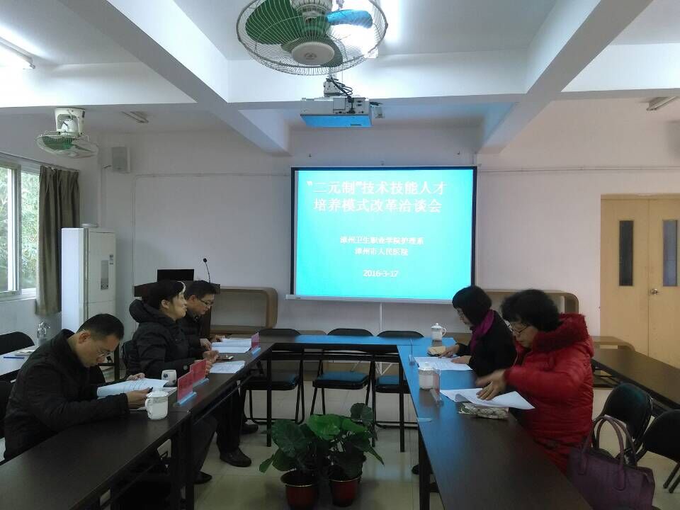 2016年3月17日,漳州市人民医院副书记林庆华在护理部主任郭瑞英的陪同下莅临护理系,与护理系领导班子及专业带头人等共同商讨“二元制” 中高职一贯制护理人才培养计划。