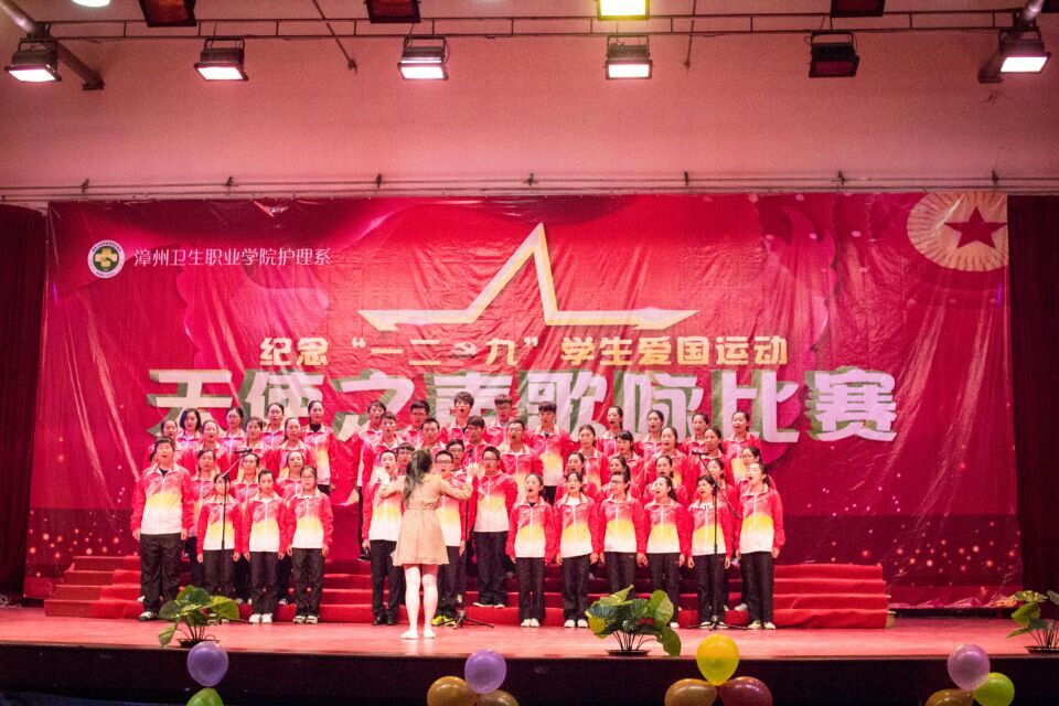 为纪念“一二·九”学生爱国运动80周年,12月4日,护理系“天使之声歌咏比赛”在阳光体育馆顺利举行。