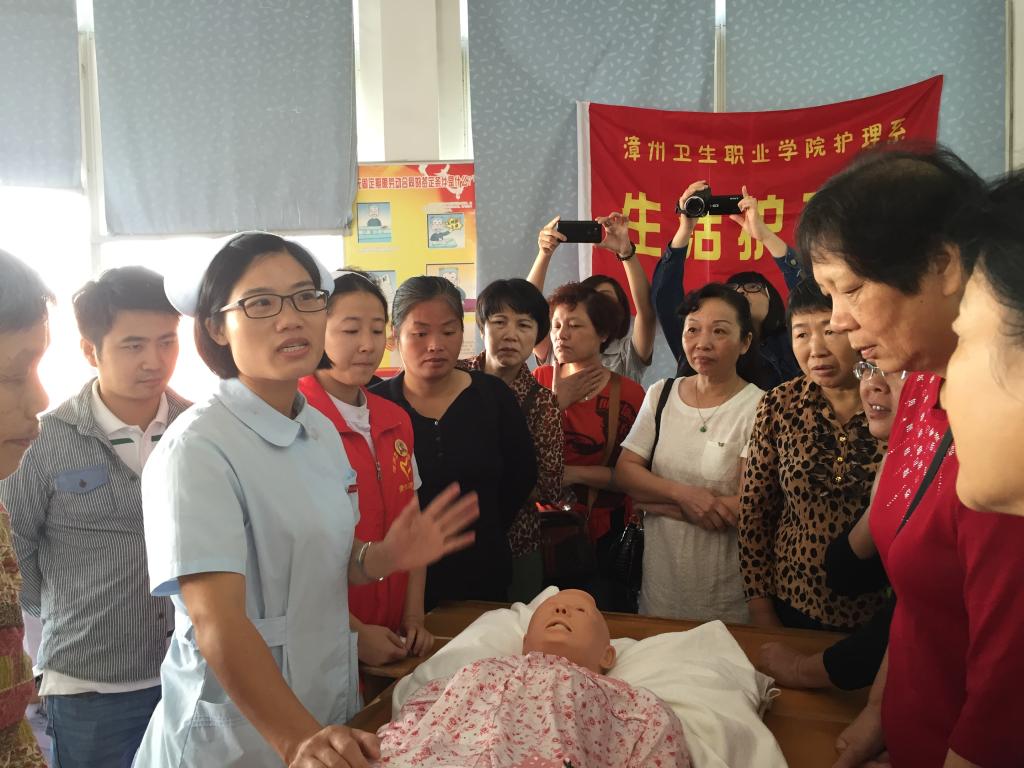 本次活动以老年人护理为主展开服务,服务队及社团利用模型现场示范、指导如何为老年人床上洗头,口腔清洁,穿、脱衣服,翻身拍背,酒精擦浴以及压疮预防等。师生们在示教之余,热情地接待前来咨询的老人,耐心地为大家答疑解惑,有针对性地开展健康教育宣传活动。