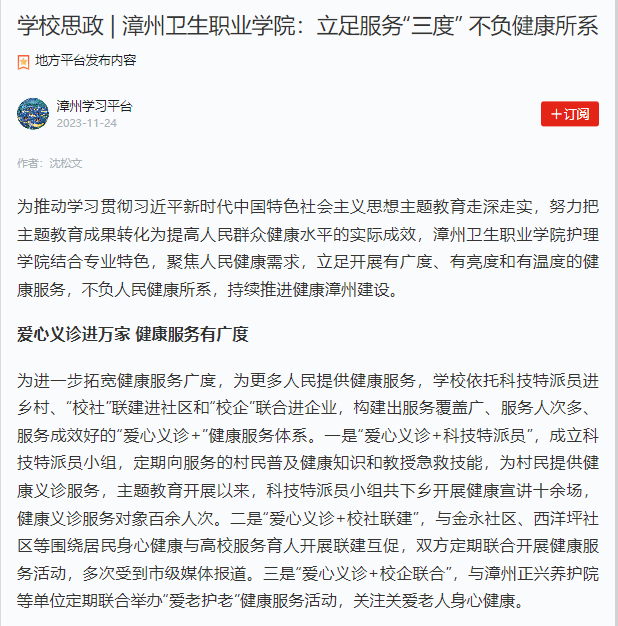 媒体护苑|学习强国:学校思政|漳州卫生职业学院:立足服务“三度”不负健康所系