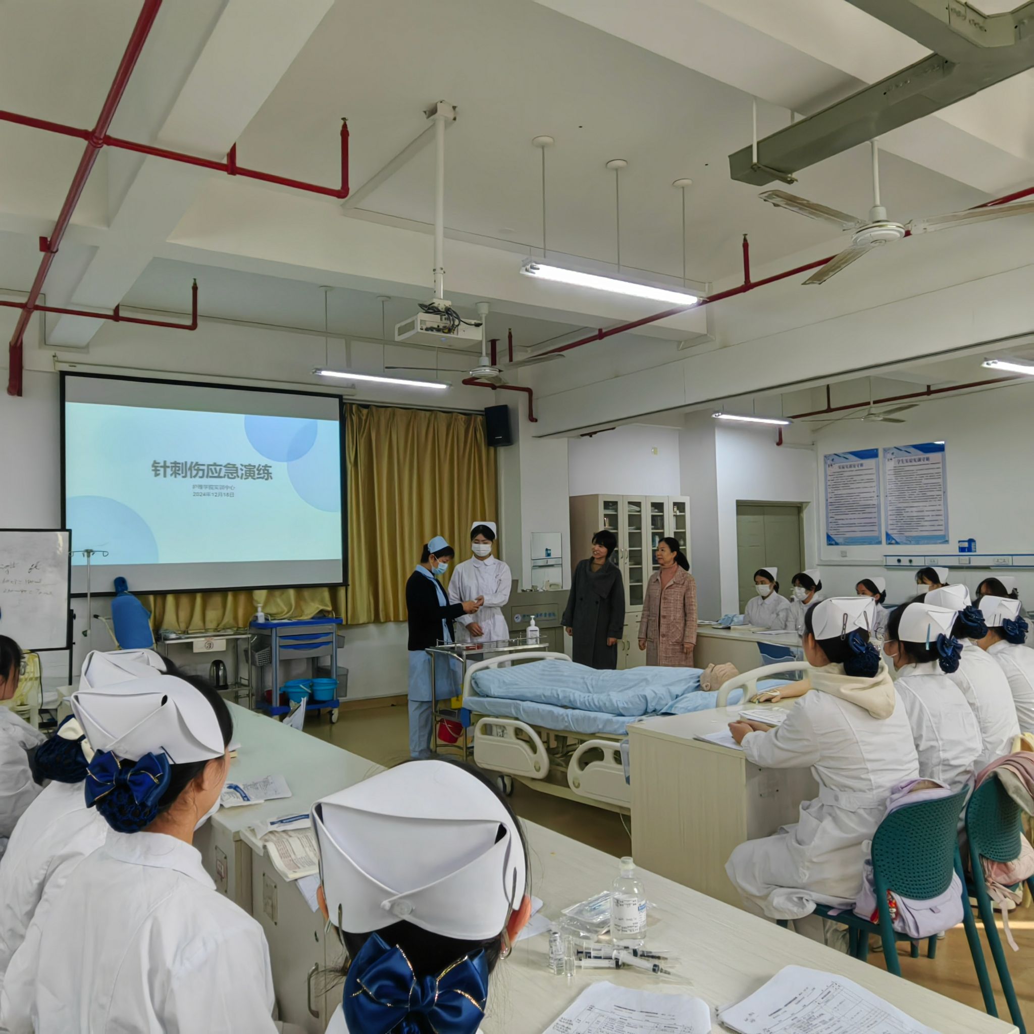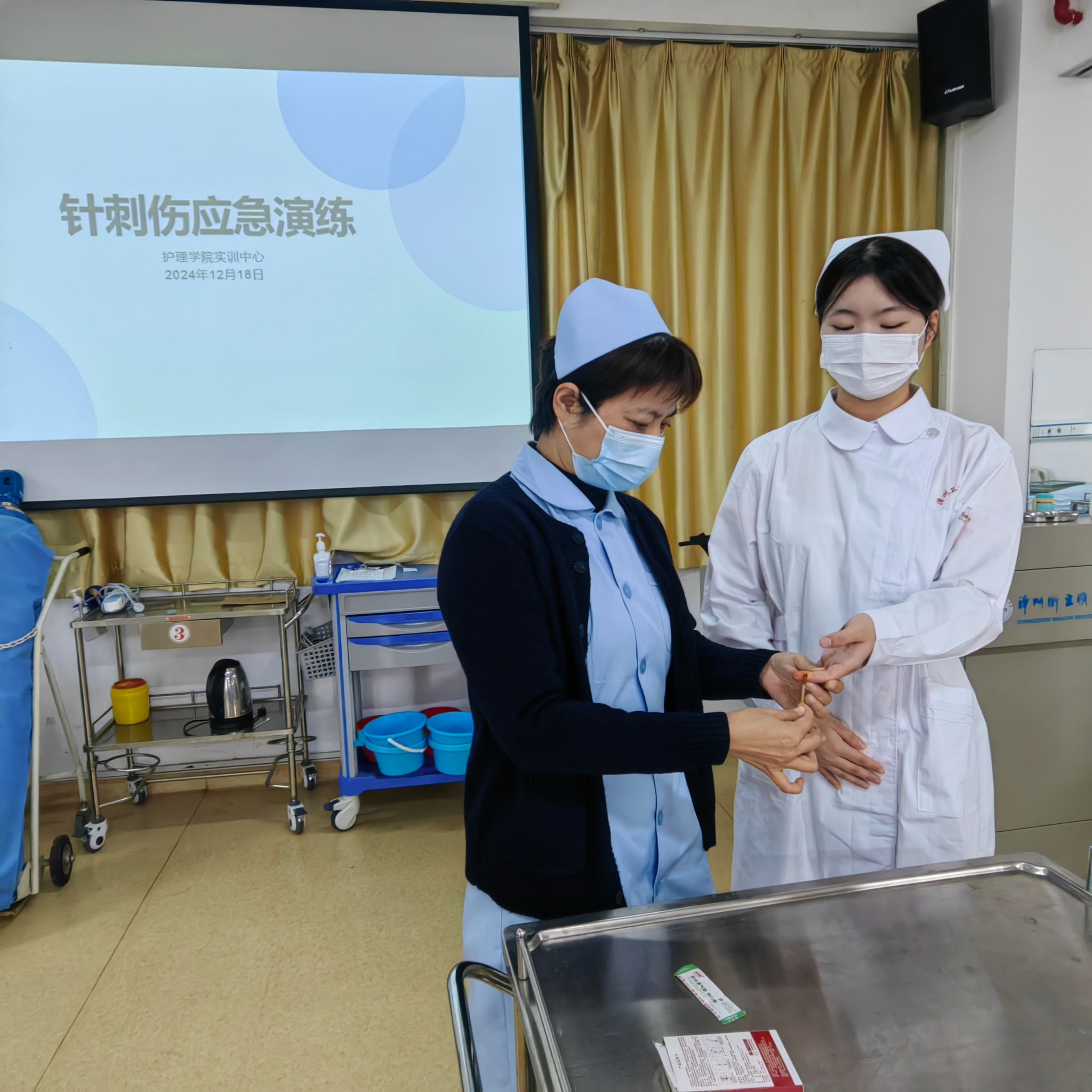 为切实提升师生的锐器操作安全意识及应对针刺伤的紧急处理能力,全面加固实训室安全管理体系,12月18日上午,我院实训中心精心组织了一场针刺伤应急处理演练。本次演练由学院副院长带队,携手资深专任教师及实训中心全体成员共同参与。