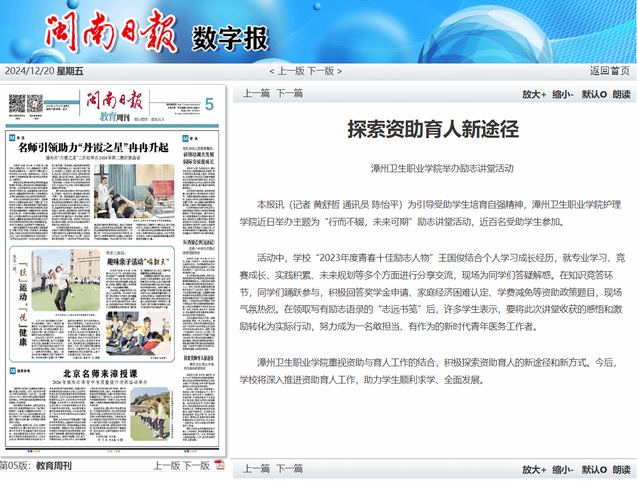 媒体护苑|闽南日报:探索资助育人新途径 漳州卫生职业学院举办励志讲堂活动