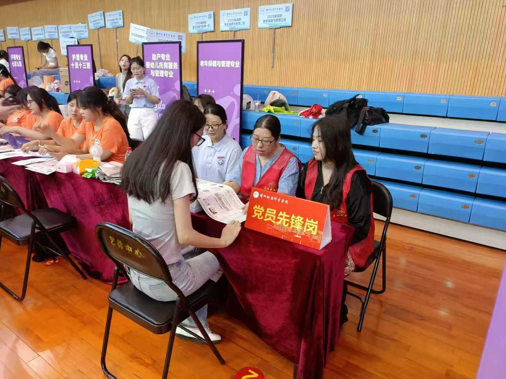 清晨 7 时许,党员教师身着统一服装、佩戴党员徽章与服务标识,带领党员学生及入党积极分子,在校园入口、报到大厅、宿舍楼等关键区域设点,搭建 “校门到宿舍” 无缝 “红色服务链”。现场既协助完成信息核验、行李搬运等基础服务,更结合护理专业特色,详解课程实训、职业发展方向,还以自身经历科普入党知识,把 “服务” 与 “育人” 深度融合,让新生们在入学伊始便感受到党的关怀与引领。