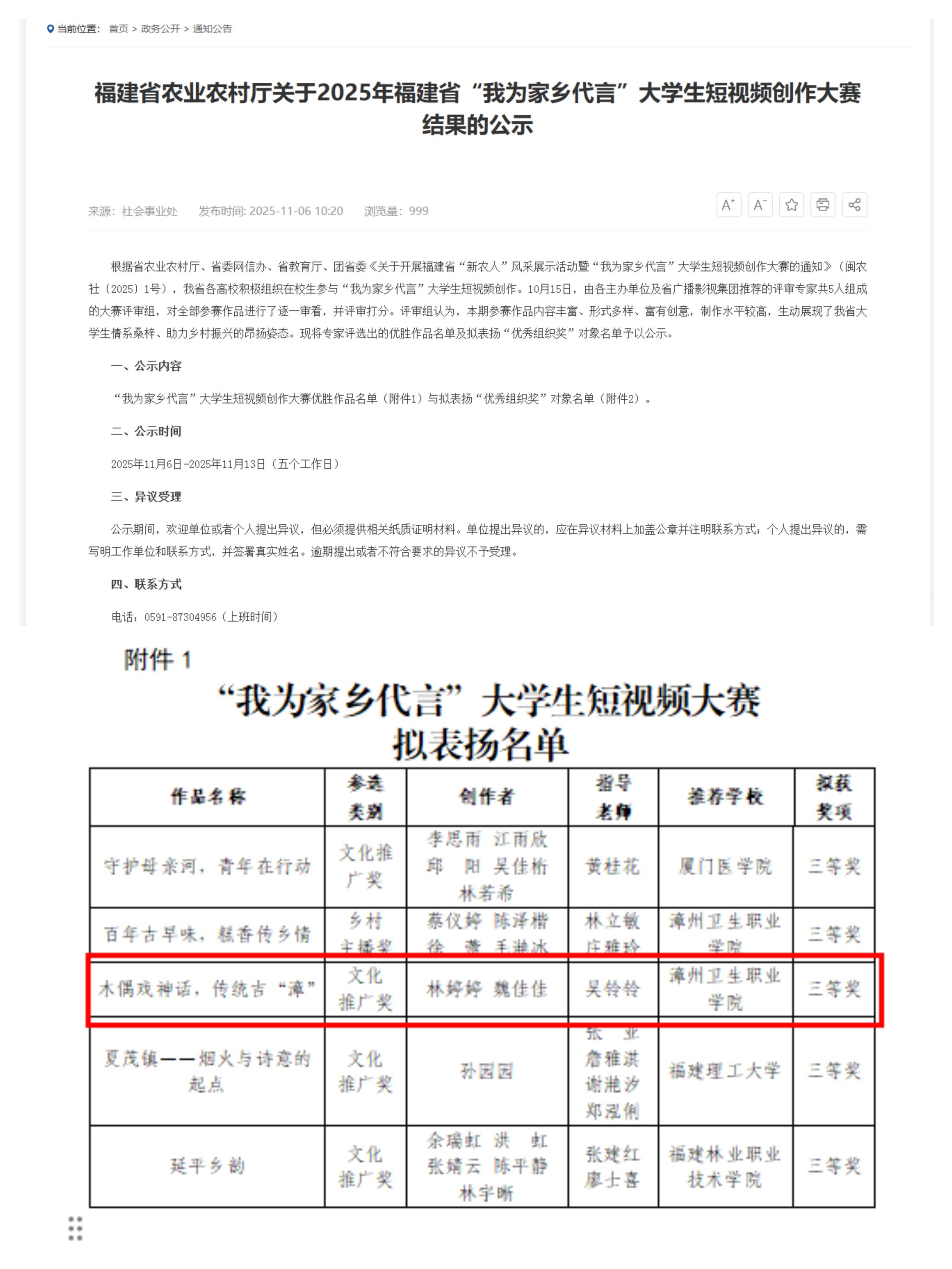 近日,由省农业农村厅、省委网信办、省教育厅、团省委联合主办的2025年福建省“我为家乡代言”大学生短视频创作大赛评审结果正式公示。由我院吴铃铃老师指导的《木偶戏神话,传统吉“漳”》凭借深刻的主题内涵、精湛的镜头呈现与鲜明的艺术特色,在全省众多优秀作品中脱颖而出,荣获三等奖。