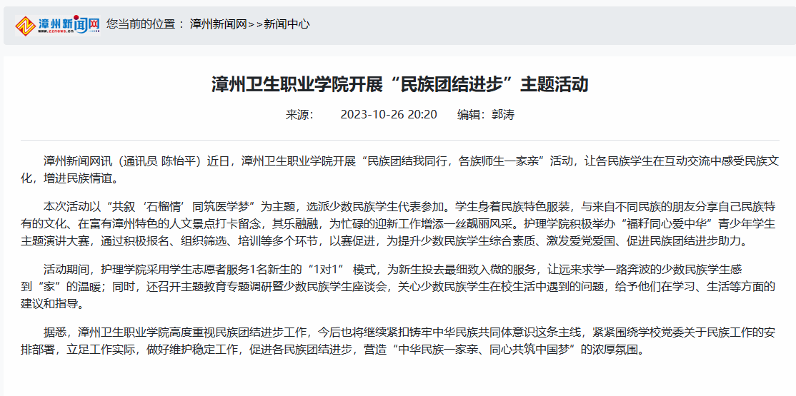 漳州新闻网:漳州卫生职业学院开展“民族团结进步”主题活动