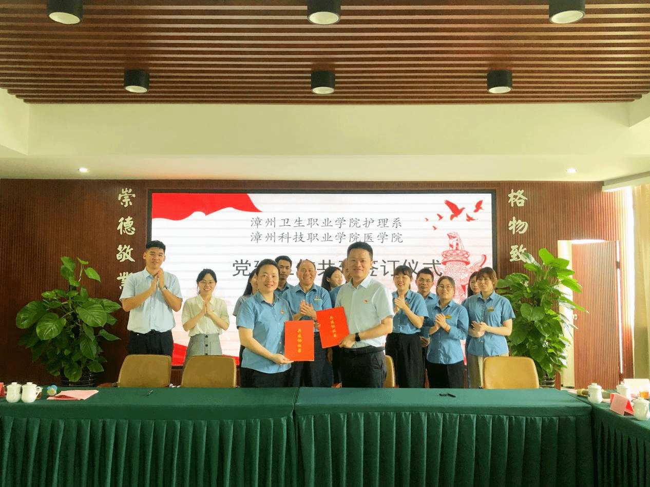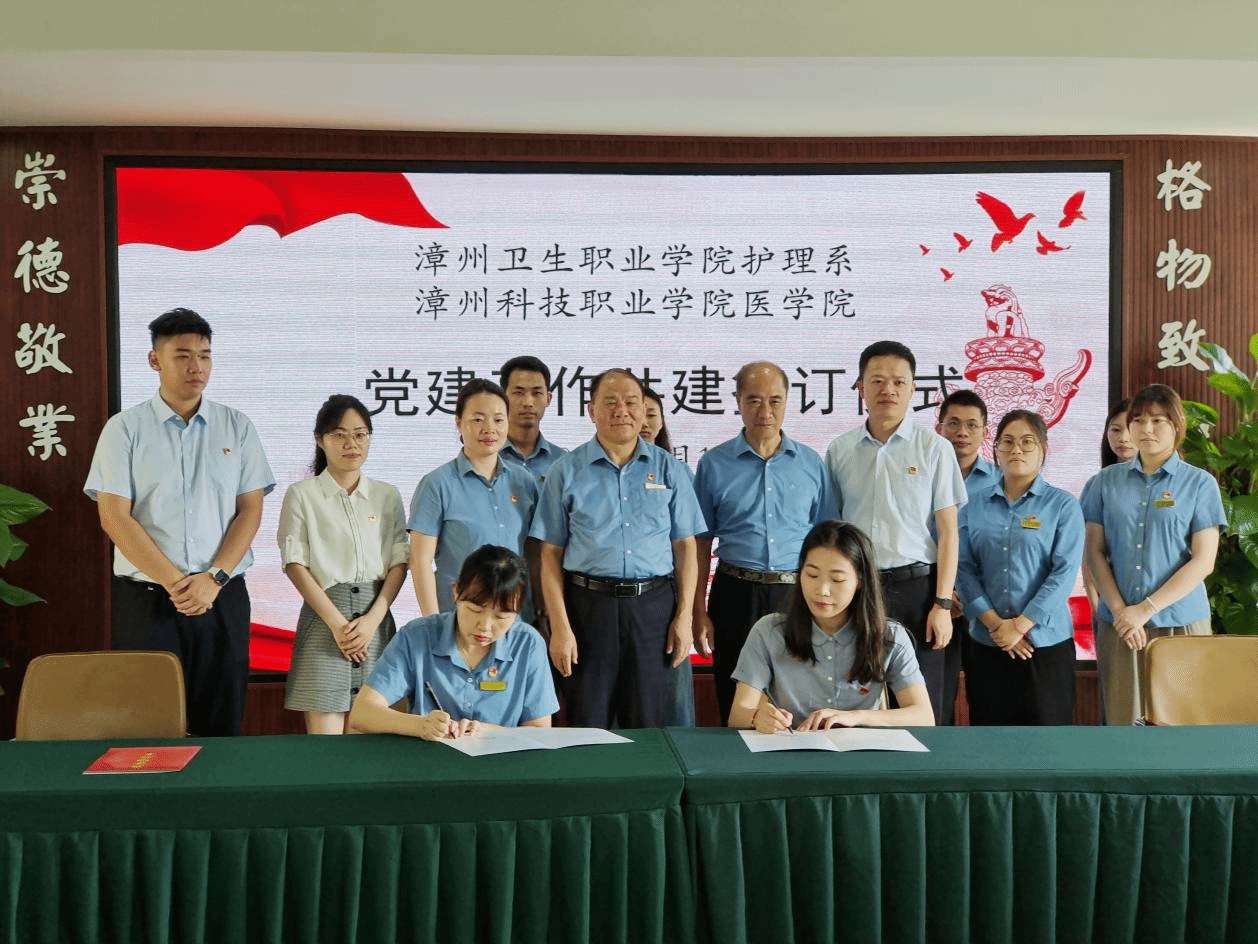 为深入学习贯彻党的二十大精神,进一步扎实推进党建“双创”工作,全面提高党建工作质量,2023年6月13日,护理学院党总支书记练建斌带领一行人赴漳州科技职业学院医学院交流,漳州科技职业学院校长,党委副书记李奠础、医学院党总支书记黄翠萍及支部相关老师参加了活动,双方签订了党建共建协议。