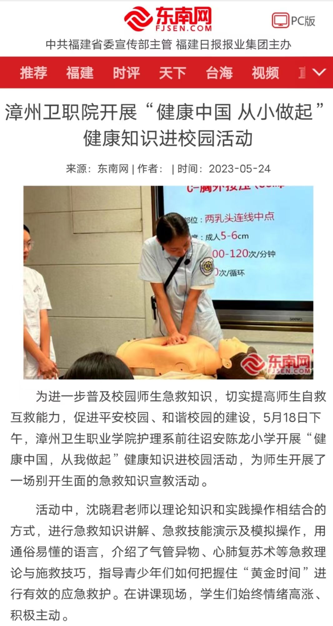 东南网:漳州卫职院开展“健康中国 从小做起”健康知识进校园活动