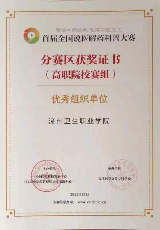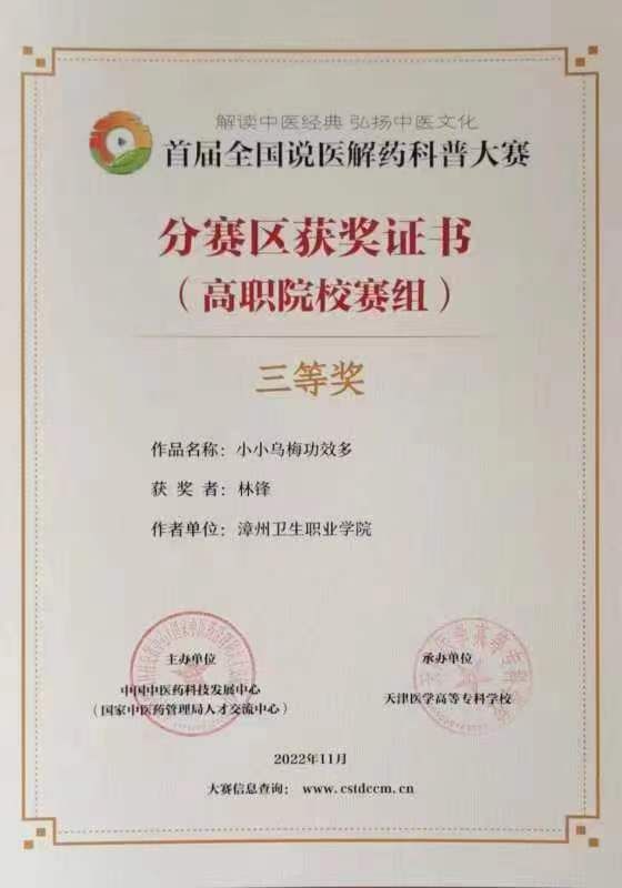 学院积极组织,广泛动员师生参与“高职院校赛组”赛项,弘扬传统中医文化、展现高职院校师生的专业素养、职业精神和良好精神风貌。学院在“高职院校赛组”赛项中荣获“优秀组织单位”荣誉称号。经过激烈角逐和严格的评审,本赛项最终评选出高职赛组一等奖3项,二等奖5项,三等奖10项及最佳创意奖4项。护理系林锋老师的作品《小小乌梅功效多》从350件参赛视频作品中脱颖而出,荣获“高职院校赛组”三等奖,并进入全国总决赛,预祝在全国总决赛中披荆斩棘、再创佳绩!