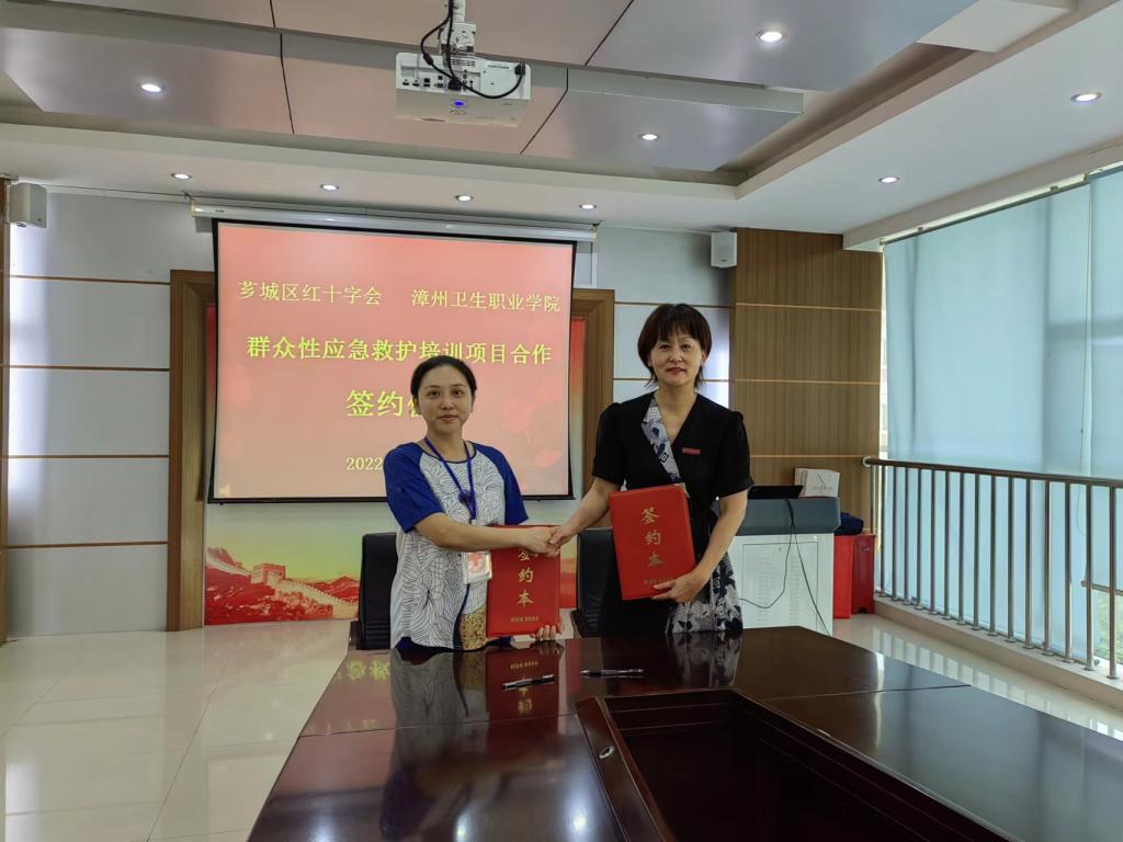 2022年6月28日,漳州卫生职业学院与芗城区红十字会群众性应急救护公益培训合作项目签约仪式在漳州卫生职业学院四楼会议室举行。芗城区红十字会吴蓥常务副会长一行受邀出席签约仪式,学院陈义三副院长、继续教育学院院长、护理系主任等出席签约仪式,继续教育学院陈美燕院长与芗城区红十字会吴蓥常务副会长签订培训合作协议。