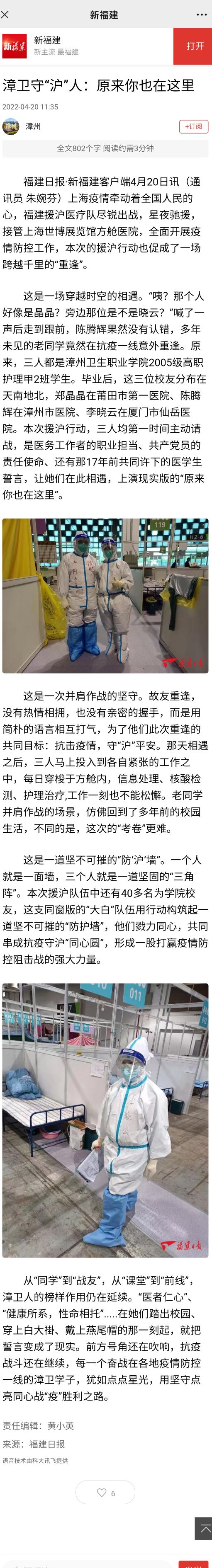 4月20日,福建日报·新福建客户端刊发题为《漳卫守“沪”人:原来你也在这里》的报道,报道了疫情之下漳州卫生职业学院优秀毕业校友驰援上海坚守一线抗疫的故事。