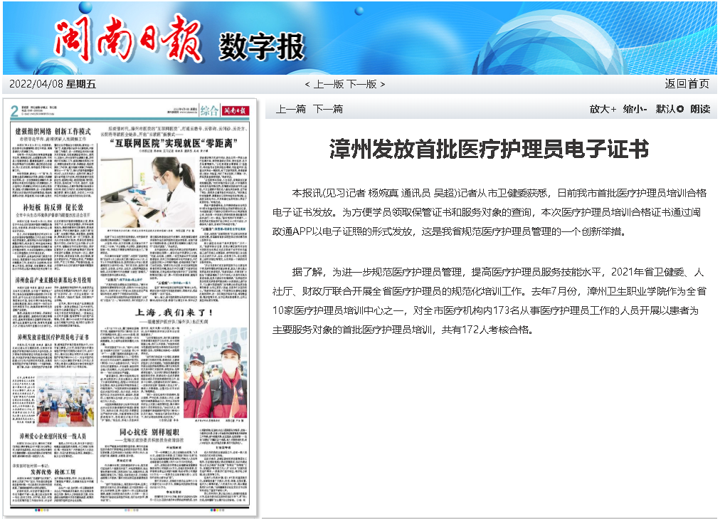 为进一步规范医疗护理员管理,提高医疗护理员服务技能水平,去年7月份,漳州卫生职业学院作为全省10家医疗护理员培训中心之一,对全市医疗机构内173名从事医疗护理员工作的人员开展以患者为主要服务对象的首批医疗护理员培训,该新闻被“闽南日报”报道,具体如下: