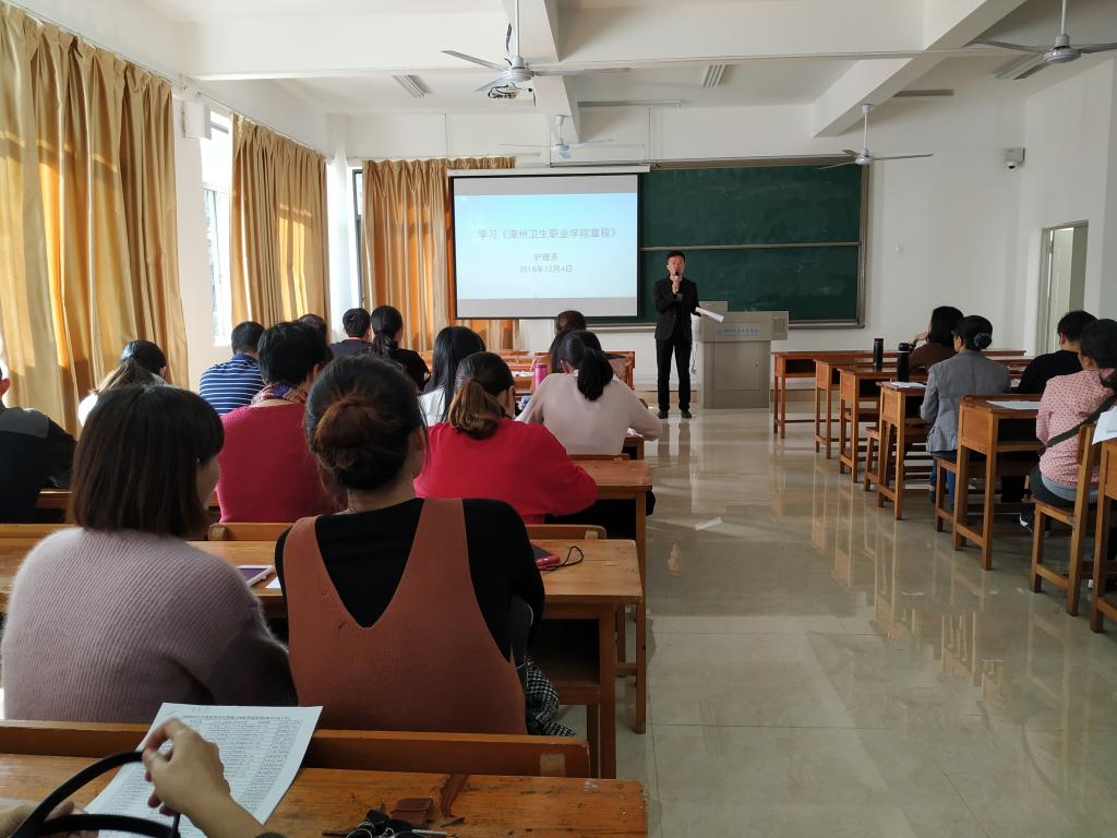为切实贯彻实施好《漳州卫生职业学院章程》,全面推进依法治校,12月4日下午,护理系全体老师在厚德楼202教室学习《漳州卫生职业学院章程》,系党总支副书记做了专题讲解。