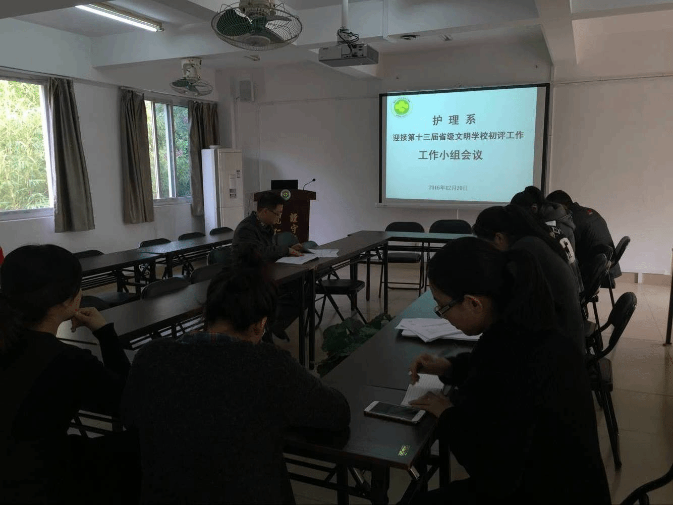 为更好地完成第十三届省级文明学校初评工作,12月20日,护理系分别在七号楼会议室和致馨楼108教室召开工作小组和全体教职工会议进行动员部署工作,会议由护理系党总支副书记主持。