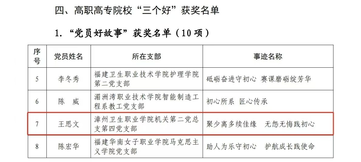 近日,中共福建省委教育工委公布了“支部好案例、书记好党课、党员好故事”优秀成果获奖名单。机关第二党总支第四党支部王思文老师《聚少离多续佳缘 无怨无悔践初心》获评“党员好故事”奖项。