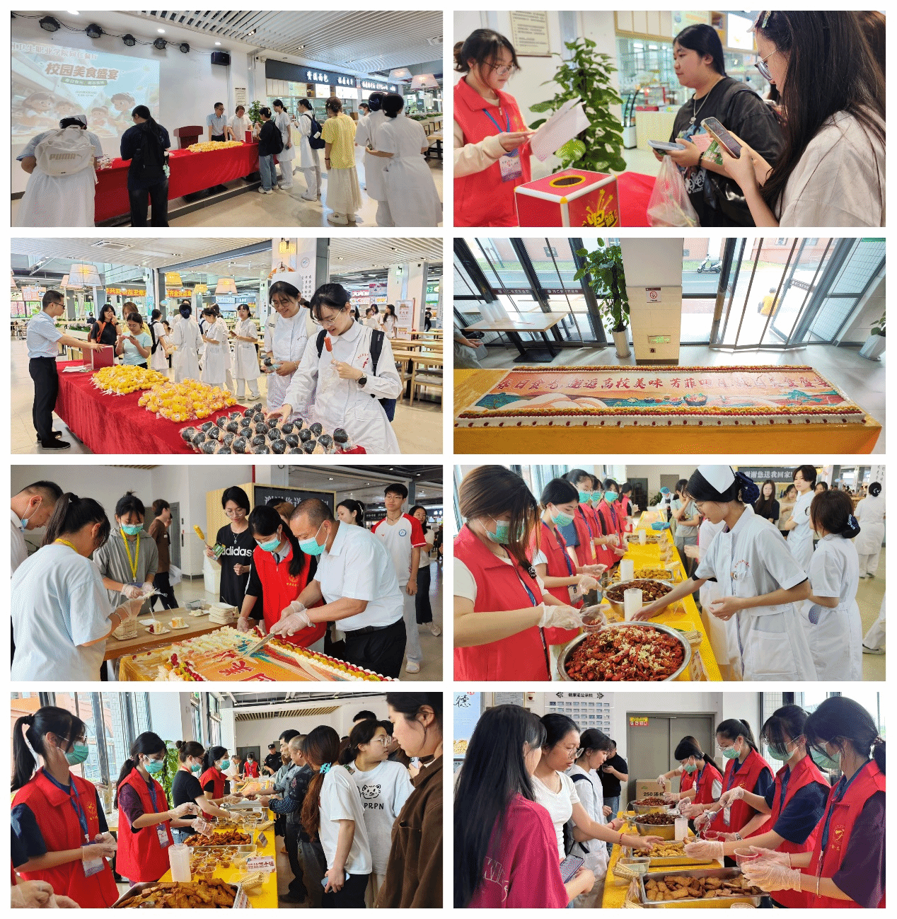 本次美食节汇聚了多种令人垂涎的佳肴,包括香甜的3米大蛋糕、鲜香的小龙虾、软糯入味的红烧肉以及各式精美小食,供来宾免费品尝。活动现场不仅提供丰富多样的美食,还设置了趣味食安知识问答环节,吸引了众多师生和员工前来参与。此外,活动还特别设计了食品安全知识问答互动,参与者答对问题即可获得精美小礼品一份,现场气氛热烈,欢声笑语不断。