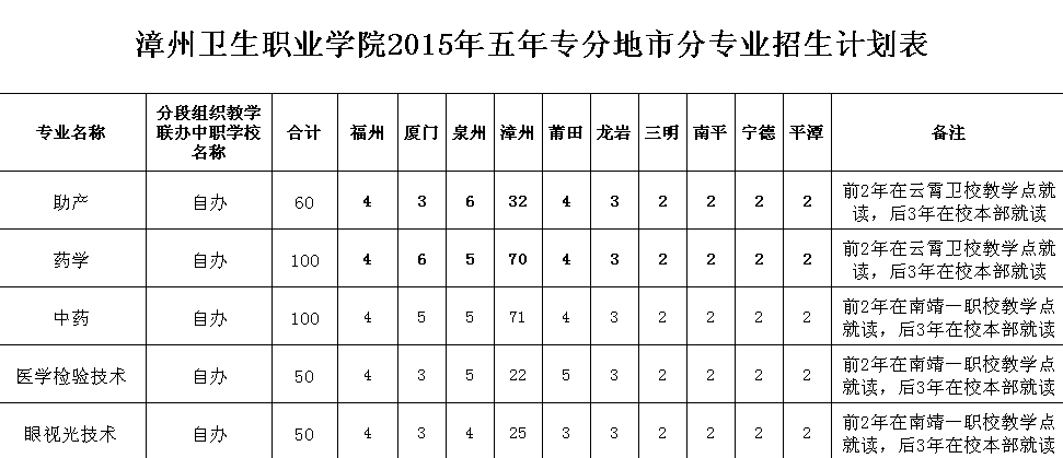 漳州卫生职业学院2015年五年专分地市分专业招生计划表