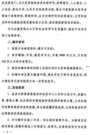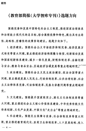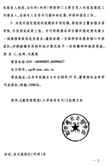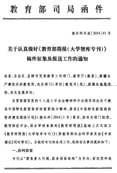 附件:《关于认真做好〈教育部简报(大学智库专刊)〉稿件征集及报送工作的通知》(教社科司函〔2014〕41号)