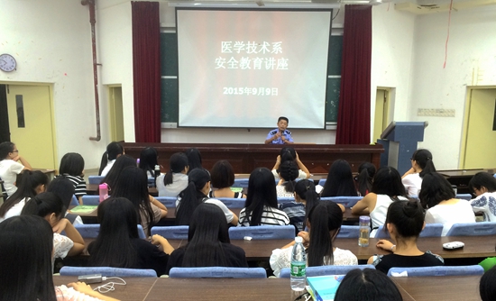 9月9日晚,医学技术系于明德楼3教举办2015级新生安全教育讲座,县前派出所民警董宏梦应邀主讲,系部328名新生均参与听讲。