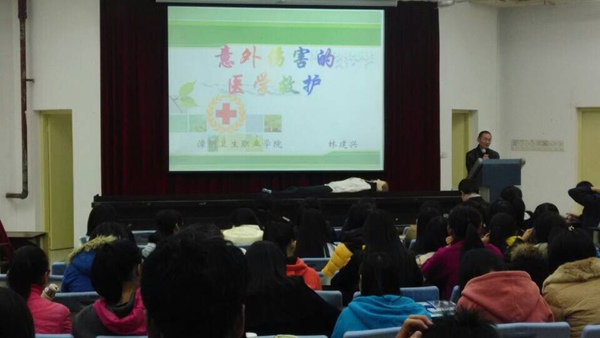 12月22日晚,基础医学部邀请护理系副主任林建兴老师在明德楼3教为14级新生开展意外伤害医学救护专题讲座。