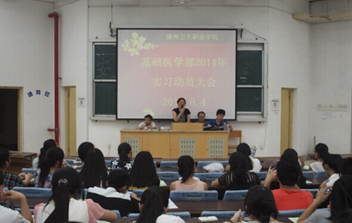6月4日晚,基础医学部在明德楼9教召开2014年实习动员大会。基础医学部主任、副主任、党总支副书记、团总支书记及各班辅导员、班主任和即将下临床的270余名学生参加会议。