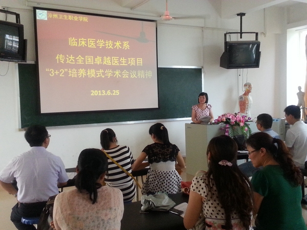 会上,系主任介绍了全国卓越医生项目“3+2”培养模式学术研讨会的召开情况,传达了教育部高教司就全国卓越医生“3+2” 培养项目的产生背景、国家层面的顶端设计思路、项目的实施要求等重要讲话精神,学习了《关于构建“3+2”临床医学人才培养模式的思考》专题讲座的主要内容。她要求系部全体教职工要提高认识、统一思想,明确目标,根据农村医疗卫生服务实际需求,围绕农村医疗卫生服务的基本要求,深化三年制临床医学专科教育人才培养模式改革,探索“3+2”(三年医学专科教育加两年毕业后全科医生培训)助理全科医生培养模式,切实履行好高校服务社会的职责。