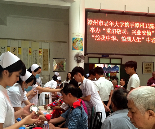 10月9日,正值重阳节,护理系“健康咨询队”、“中医保健队”师生一行20余人在漳州市老年大学开展“九九重阳享健康 敬老爱老送温情”社会服务活动。