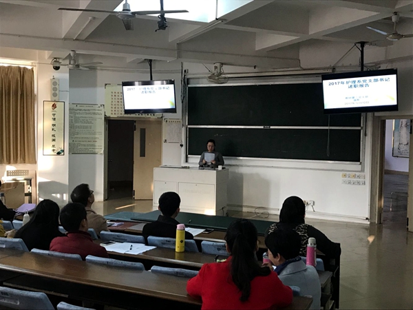 在会上,首先系党总支组织委员对本学期发展党员及吸收入党积极分子情况进行汇报,对近期党委工作部有关任务进行反馈和部署;总支宣传委员也对近期工作进行汇报,要求各支部做好本学期的政治学习和心得体会交流等工作;系党总支书记针对今年党建工作责任要求、学习贯彻党十九大会议精神及近期党委工作部有关任务进行督促和落实,强调坚持把好质量关,严格做好工作落实,能较好完成各项工作。接着,各支部书记以PPT的形式,围绕今年学院工作要点、党建工作、支部立项、教学工作、政治学习、道德讲堂、学生党员发展等方面进行了总结述职汇报,并提出了存在的问题和今后努力的方向。系党总支书记及其总支委员认真听取了各支部书记述职报告,并分别逐个进行点评,指出各自存在的问题,点评简明扼要,客观深入,肯定了成绩,也指出了不足,明确了今后努力的方向。