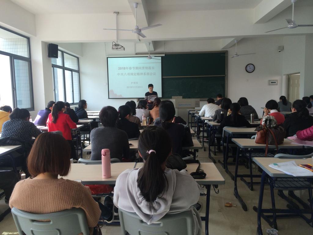 为持之以恒贯彻落实中央八项规定精神,弘扬风清气正、廉洁从教、文明节俭、为人师表的良好风尚,1月23日下午,护理系在厚德楼202教室召开贯彻落实中央八项规定精神系部教职工大会,会议由系党总支纪检委员主持,全系教职工参加。