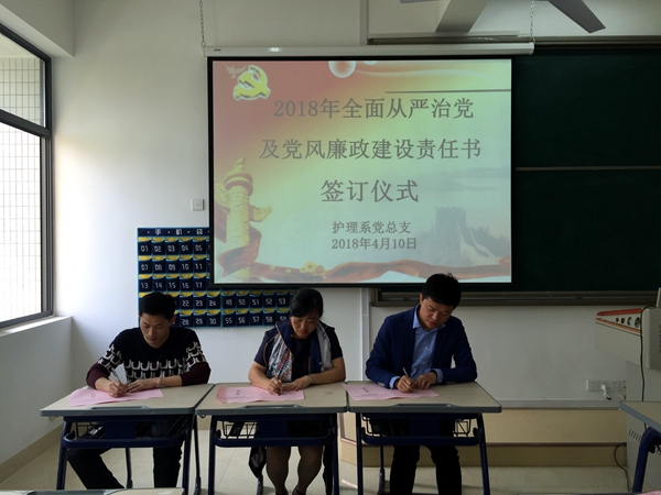 4月10日下午,护理系举行2018年全面从严治党及党风廉政建设责任书签订仪式。系班子成员及全体教职工参加了签订仪式。