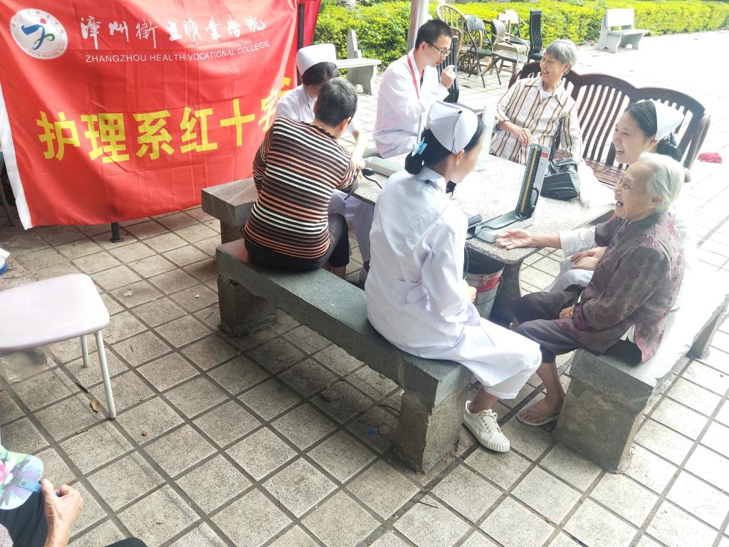 10月13日上午,护理系红十字会到金峰花园小区开展爱心义诊活动,为小区居民提供医疗咨询和检查服务。