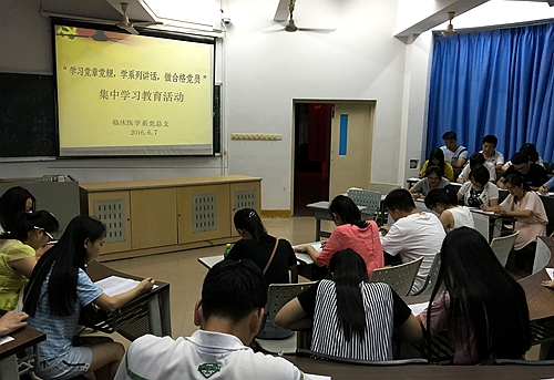 6月7日晚,临床医学系党总支组织全体党员开展“两学一做”集中学习教育与测试。以《中国共产党章程》《中国共产党廉洁自律准则》《中国共产党纪律处分条例》为主要学习内容,随后采用了试卷答题的方式进行了集中测试,以检验全系党员的学习成效。