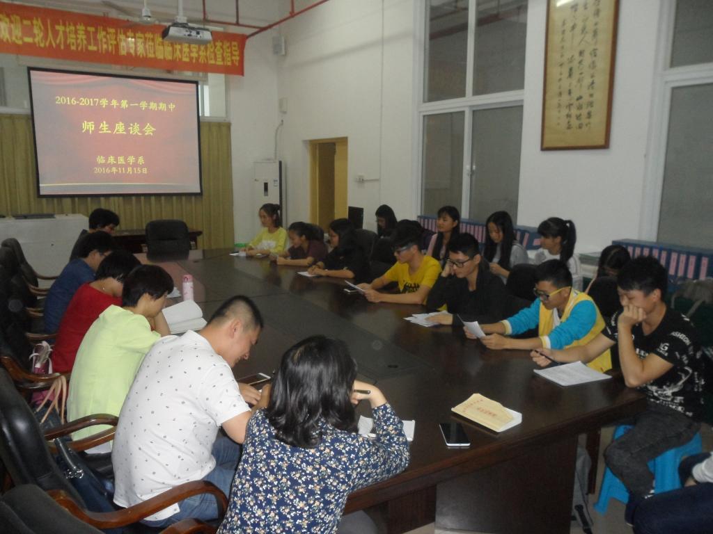 11月15日下午,临床医学系在图书馆5楼会议室召开2016-2017学年第一学期期中师生座谈会。系部领导、教研室主任、专业带头人、骨干教师,2015级及2016级各班学生代表参加了此次座谈会。