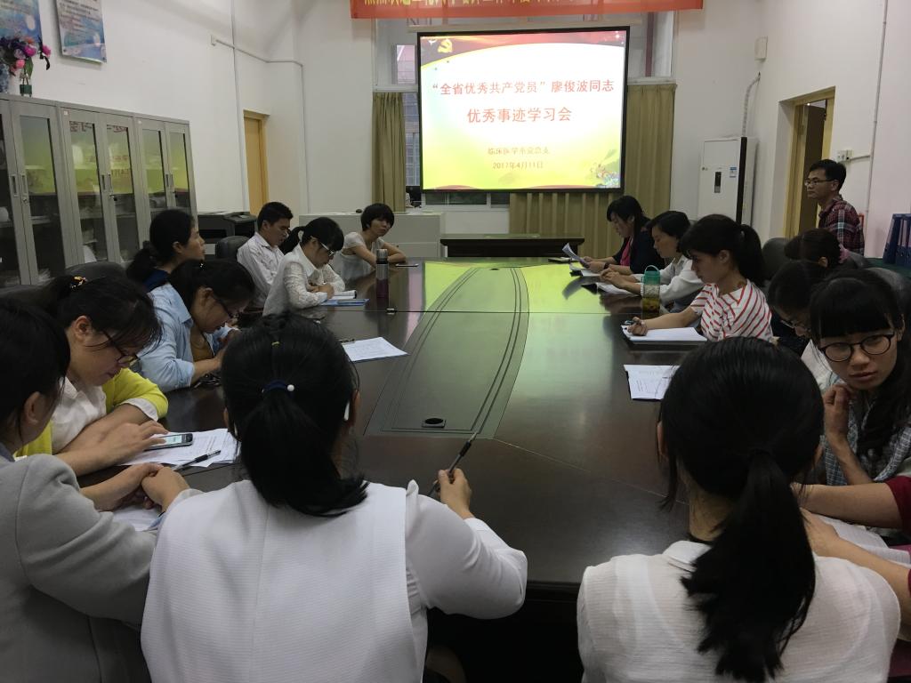 4月11日下午,临床医学系全体党员在图书馆5楼会议室组织学习了廖俊波同志的优秀事迹。会议上,党总支书记向大家介绍了廖俊波同志的优秀事迹,传达了《中共福建省委关于追授廖俊波同志“全省优秀共产党员”称号并开展向廖俊波同志学习活动的决定》文件精神。