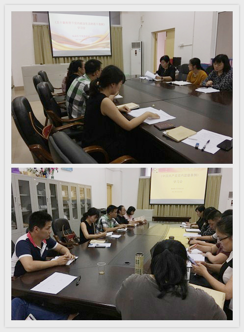 5月23日下午,临床医学系党总支书记颜晓萍主持召开系全体党员大会,学习习近平总书记在十八届六中全会上关于《关于新形势下党内政治生活的若干准则》(简称《准则》)和《中国共产党党内监督条例》(简称《条例》)的说明,并分别就《准则》和《条例》进行专题学习研讨。