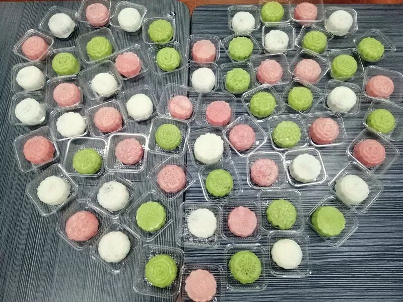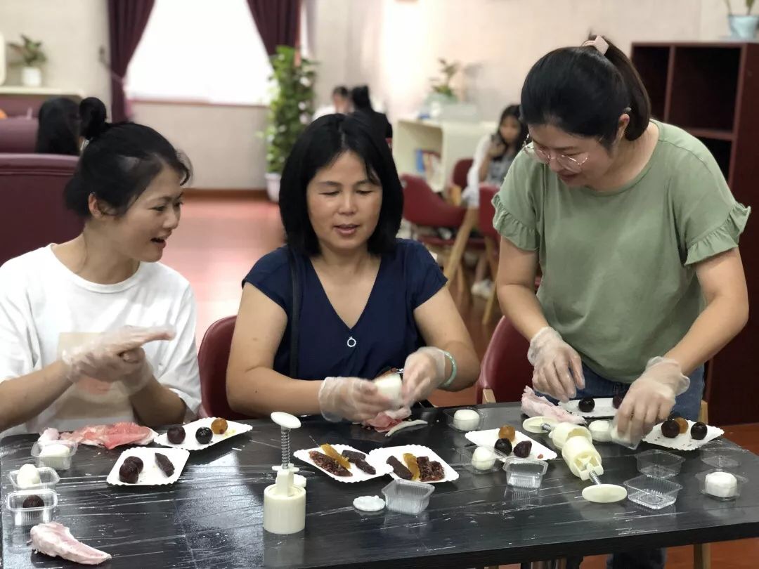 活动中,老师们自己动手,一边相互探讨着做法,一边揉面团、包馅料,场面其乐融融,一个个印有花纹的月饼在大家手中诞生,大家共同分享着冰皮月饼制作成功的喜悦,再经过精美包装,档次瞬间提升许多。