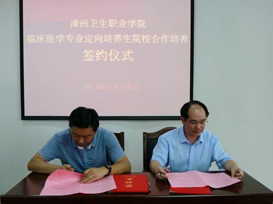 6月15日下午,在漳州市卫健委相关领导及嘉宾共同见证下,漳州卫生职业学院与漳州市第三医院、龙海市第一医院、漳浦县医院完成临床医学专业定向培养生院校合作培养协议签订仪式。