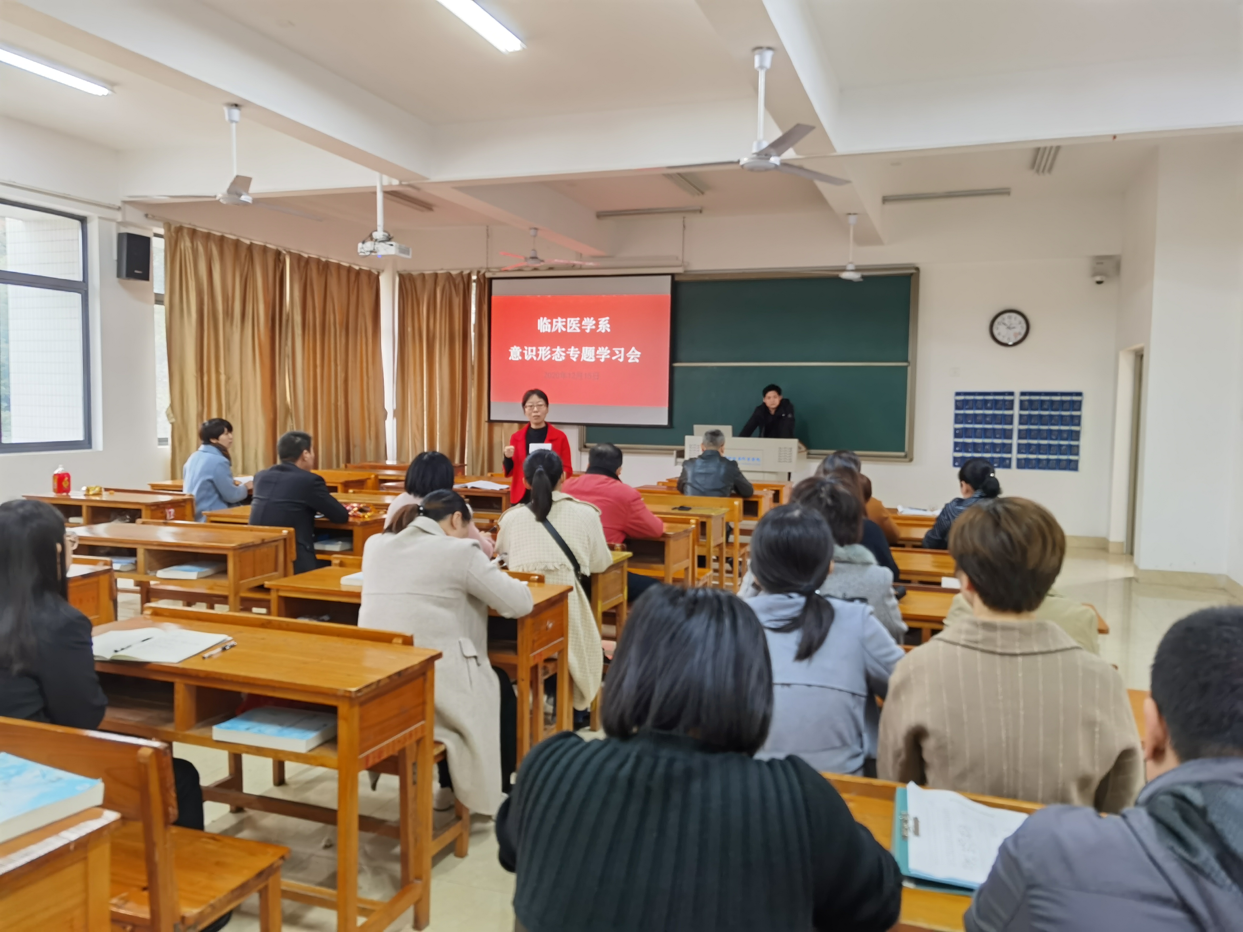 12月15日下午,临床医学系党总支于在厚德楼305室开展意识形态专题学习活动,由党总支副书记林丽端主讲,全体教工党员参加。