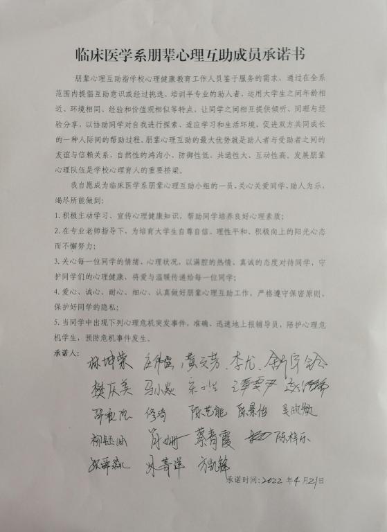 会上,郑老师指出,青年大学生往往喜欢向同龄人敞开心扉、相互交流、倾诉烦恼,青年朋辈之间易于建立良好的咨询关系、易于产生同理心、易于形成榜样效应。组建朋辈心理队伍是学校心理育人的重要桥梁,意义重大。接着,郑老师进一步从“是什么、做什么、怎么做”三个方面结合案例进行实务培训。最后,学生签订《临床医学系朋辈心理互助成员承诺书》,并讨论确定朋辈心理互助小组的队训是“友善、自信、坚韧、积极”,队名是“四叶草朋辈互助小组”。