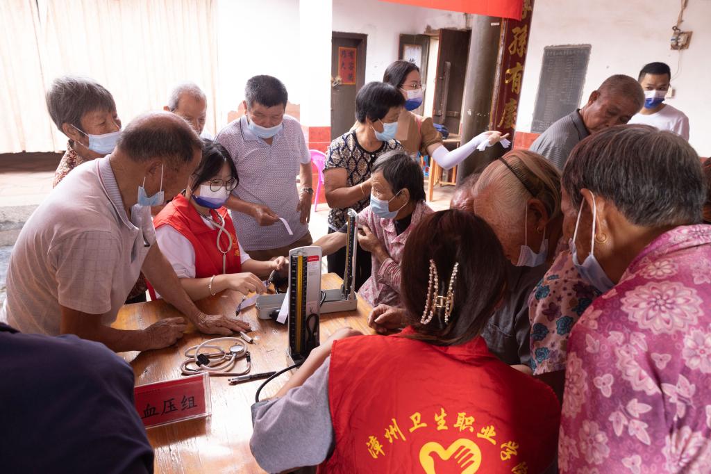 系部师生代表首先来到优秀校友——全国卫生系统先进工作者、中国青年五四奖章获得者、全国岗位学雷锋标兵、中国好医生、全国百姓满意的乡村医生陈伟琳工作的后溪村卫生所,与其签订大学生社会实践基地共建协议,并举行授牌仪式。之后,在陈伟琳的带领和指导下,志愿者们来到后溪村南山自然村老人活动中心,为村里面的老人们带来健康服务,普及急救知识、量血压、测血糖、测尿酸。健康服务结束后,活动小分队还为老人们送上花生油、肥皂等重阳节慰问品,现场气氛火热,老年人们其乐融融。活动过程中,陈伟琳对村里面的每个老年人的身体状况如数家珍,对待村民态度温和,极具耐心。同学们目睹了并参与了现场的一频一幕,进一步体验到了从医所需要的尊重生命、厚德仁爱、无私奉献、慎始慎终等品质,感受到身上沉甸甸的责任。