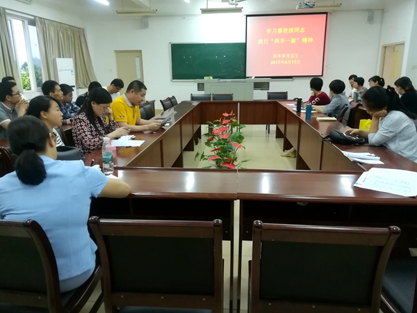 4月11日下午,药学系党总支在致远楼309会议室组织全系教职工开展学习廖俊波同志践行“两学一做”的精神。