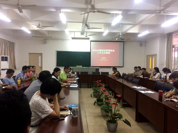 9月19日下午,药学系党总支在教职工例会上传达了市属高校思想政治工作会议精神。9月8日,漳州市属高校思想政治工作会议在漳州宾馆召开。市委书记檀云坤出席会议并讲话,强调要深入学习贯彻习近平总书记、省委尤权书记在全国、全省高校思想政治工作会议上的重要讲话精神。会上,檀书记指出,各有关部门各高校要突出重点抓落实,精准发力补短板,推动高校思想政治工作强起来、实起来、活起来。强调要始终坚持社会主义办学方向、要提高学生思想政治素质、要深化高校师资队伍建设、要推进思想政治工作创新。